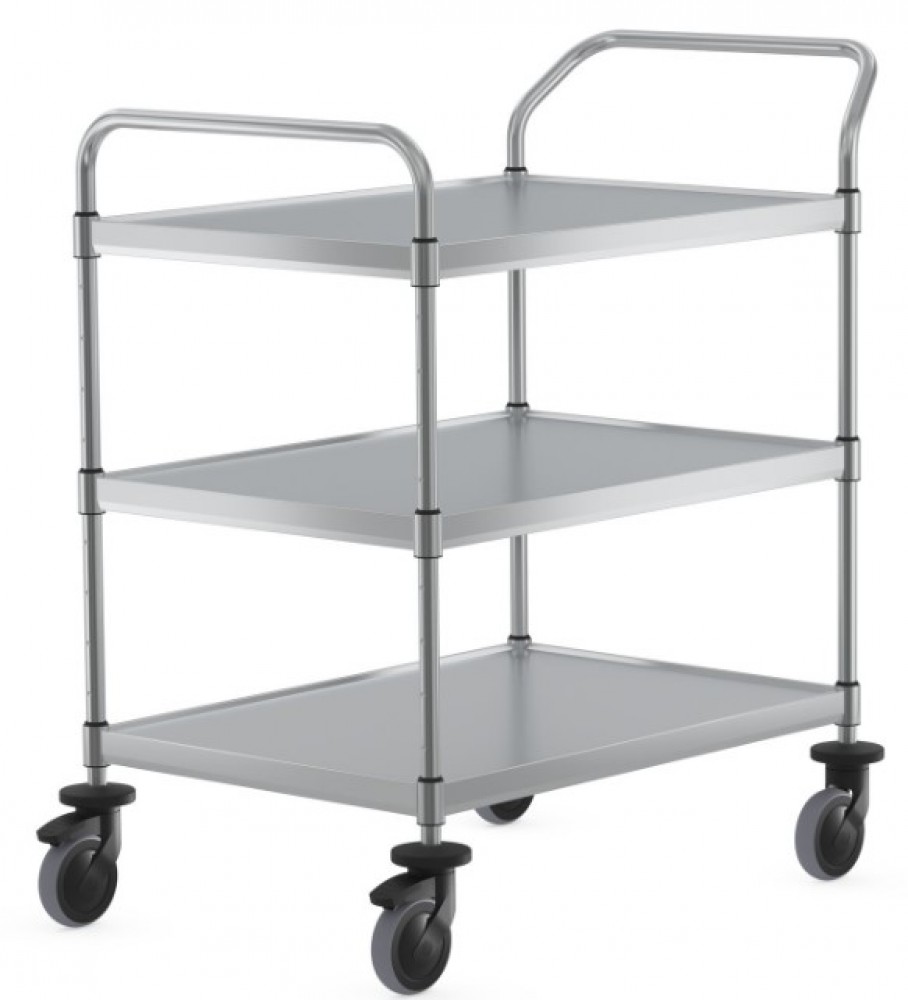 Ergonomic use is ensured by the stainless steel push handles and height-adjustable shelves.